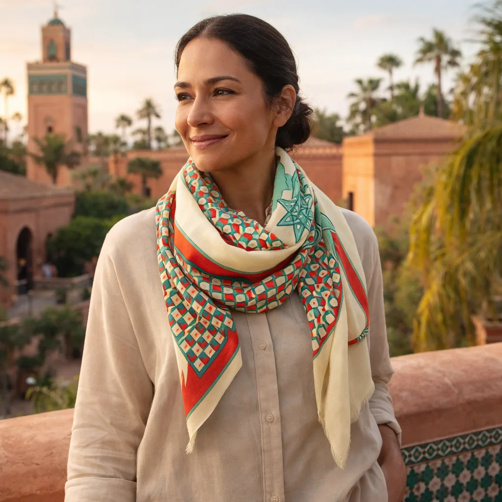 Adding a scarf is one of the simplest ways to introduce Moroccan style into everyday fashion. It adds texture, movement and a subtle cultural touch.