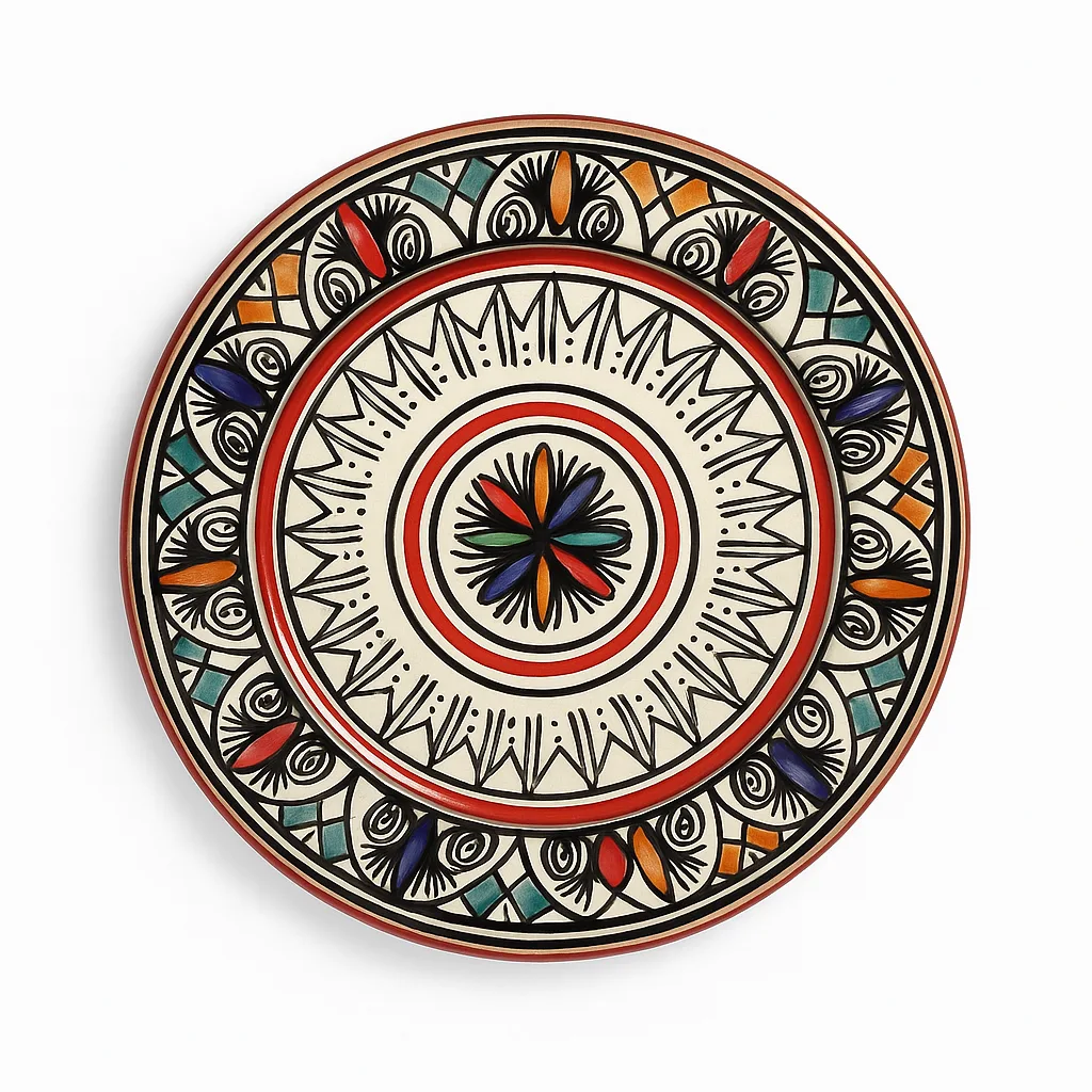 This artistic Moroccan plate displays a stunning multicoloured circular design with bright red, blue, orange, and green details. Each stroke is applied by hand, making every piece truly one-of-a-kind. Whether used for serving or displayed on a wall, it adds instant Moroccan charm.
