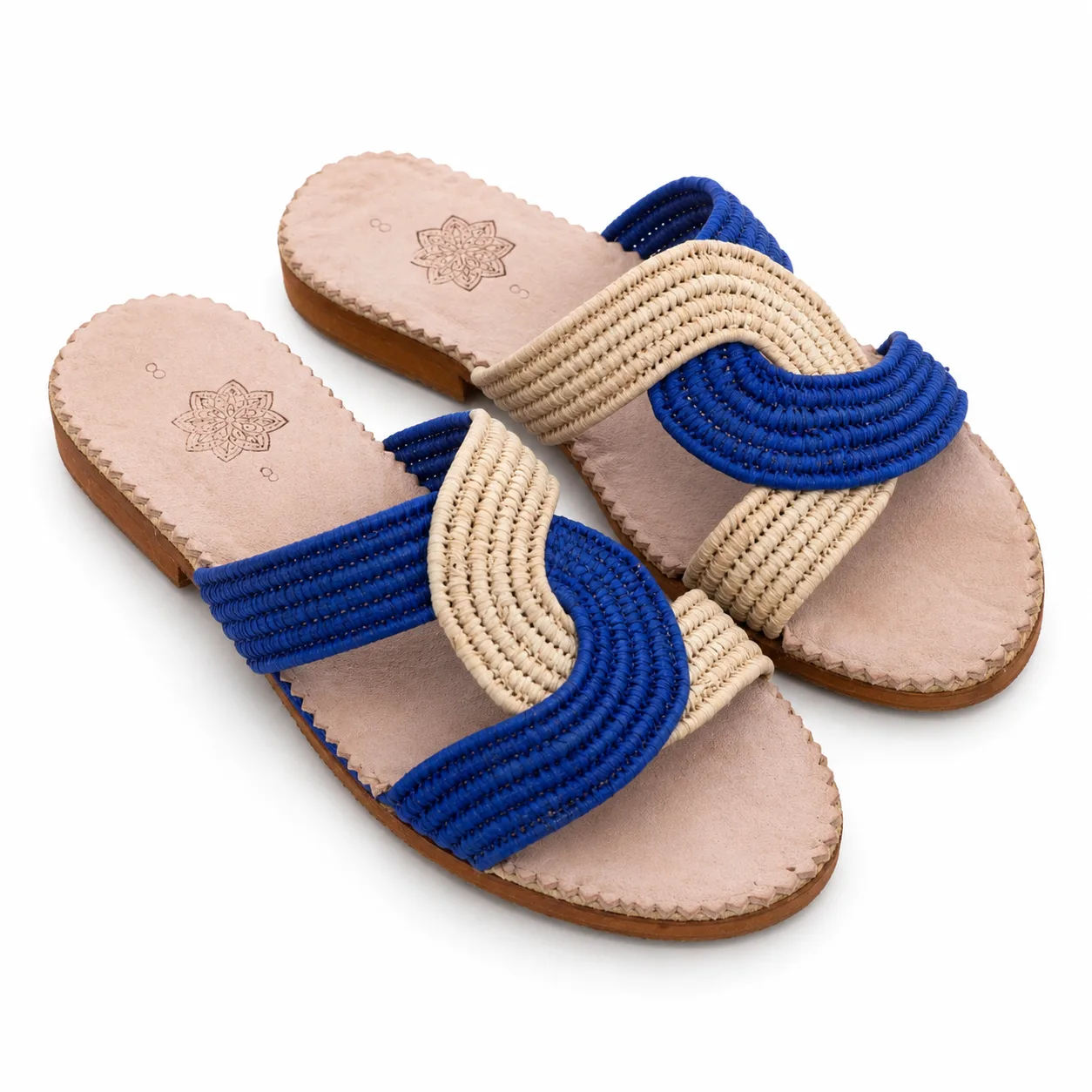 Step into refined comfort with these exquisite Moroccan slippers, beautifully handcrafted by skilled artisans. Featuring interwoven azure blue and natural sand raffia bands, these mules showcase an eye-catching wave pattern and meticulous stitching around the soft beige leather footbed. The supple leather sole brings a lightweight, breathable feel—perfect for summer days and leisurely evenings. Each pair tells a story of Moroccan craftsmanship, blending centuries-old tradition with contemporary design. The contrasting colours and unique textured pattern make these slippers both timeless and boldly fashionable. Wear them as stylish house shoes, holiday essentials, or standout additions to your everyday wardrobe. Key features include genuine leather, hand-braided raffia bands, comfortable open-toe cut, and artisanal floral embossing on the insole. Customers will love the unmatched blend of comfort, quality, and artisanal flair.