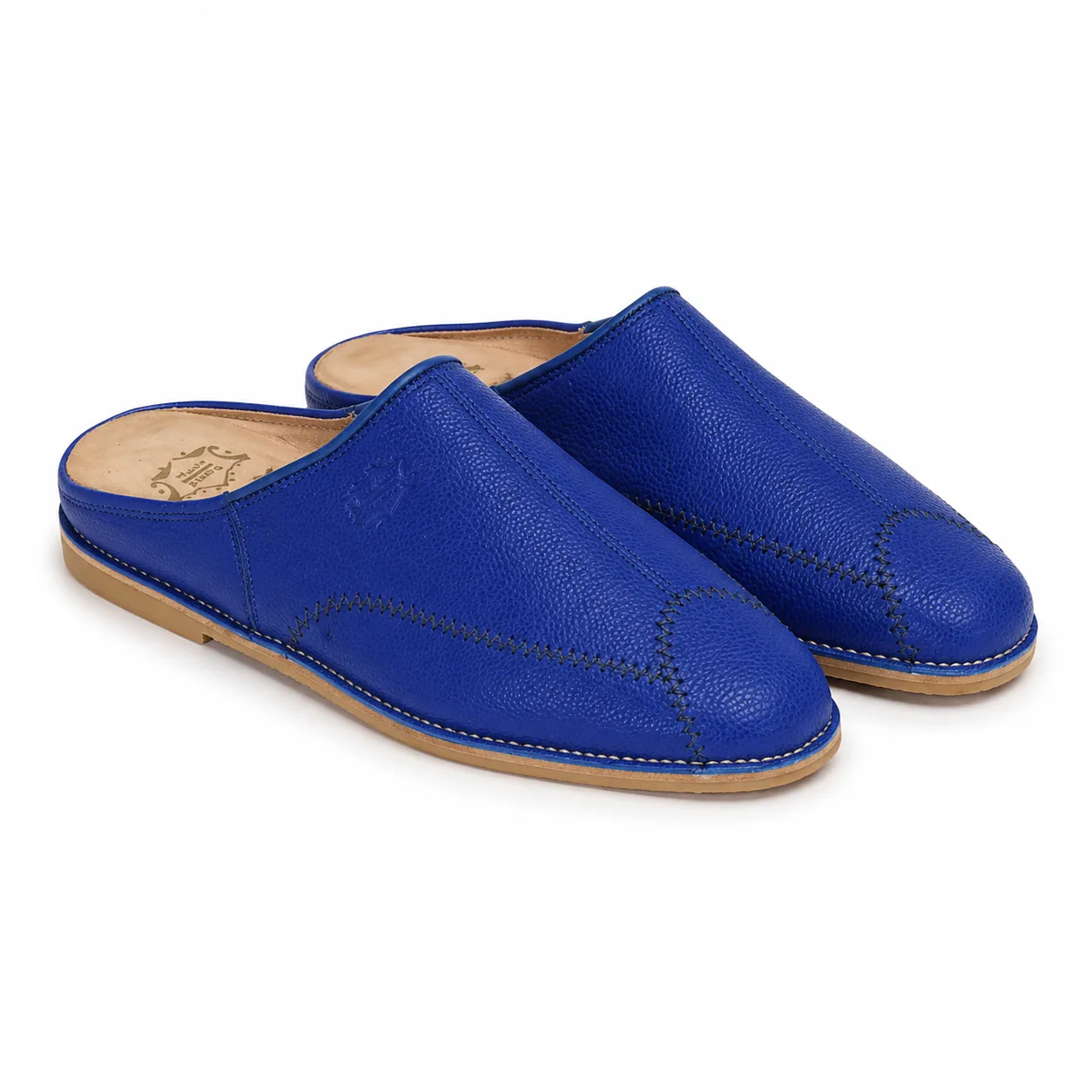 Cobalt Blue Moroccan Leather Mule Slippers with Contrast Stitching