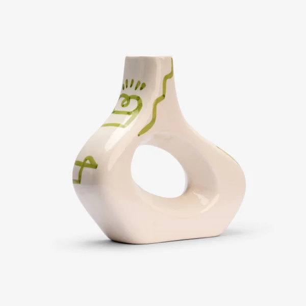 Add a bold and artistic touch to your space with this cream ceramic vase, beautifully handcrafted with a sculptural open-centre design and hand-painted green abstract detailing. Its smooth, high-gloss finish and modern organic silhouette make it the perfect decorative ceramic vase for shelves, side tables, or mantels.
