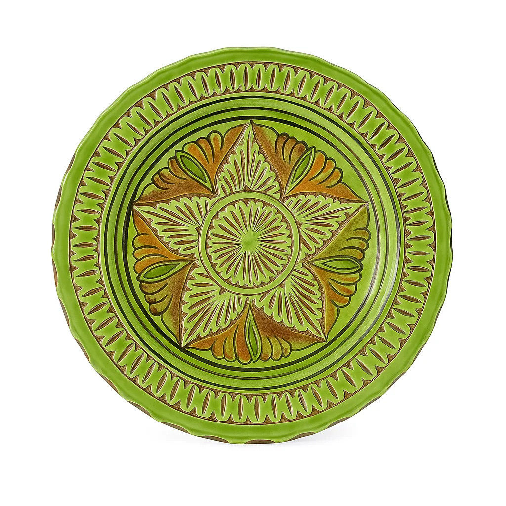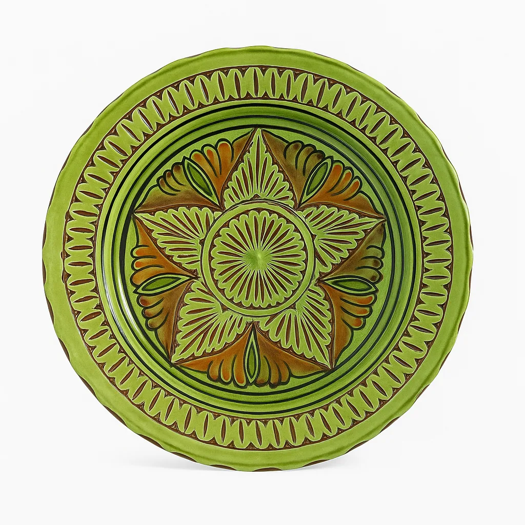 This handmade Moroccan ceramic plate features a vibrant green and brown floral star design, carved and painted with exceptional precision. Its layered patterning and glossy glaze make it perfect for adding colour to any kitchen or dining setting. Use it as a functional serving plate or as a decorative wall piece.