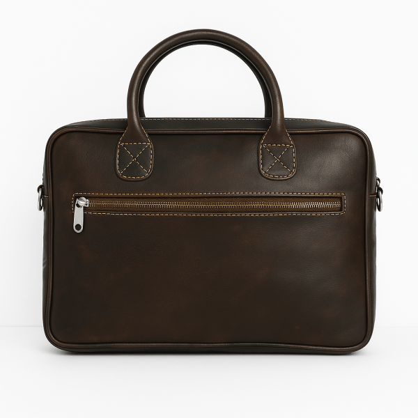 Elevate your professional look with this sleek dark brown leather laptop bag. Made from high-quality genuine leather, it features a smooth front panel and a zippered rear pocket for added functionality. The rich dark brown tone and clean silhouette make it a timeless essential for any modern wardrobe. Ideal for work, travel, or everyday carry.