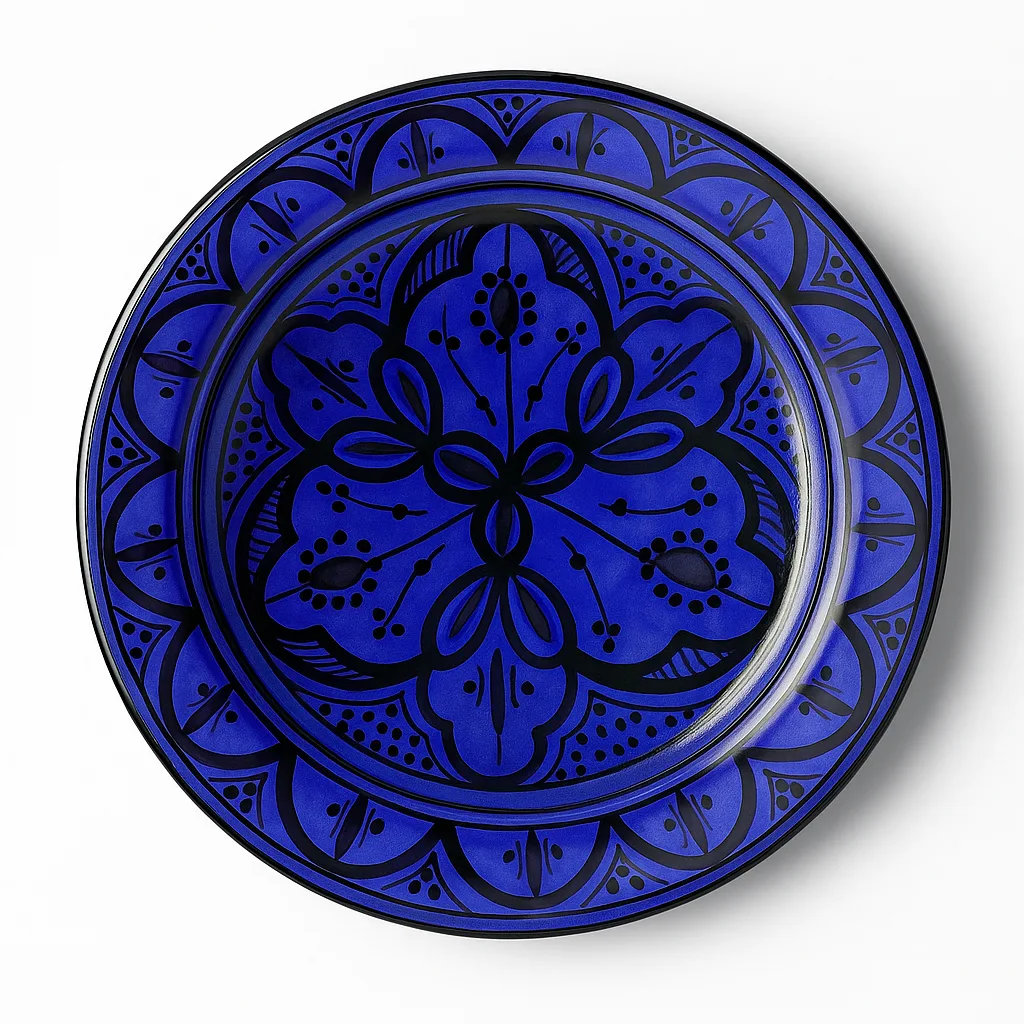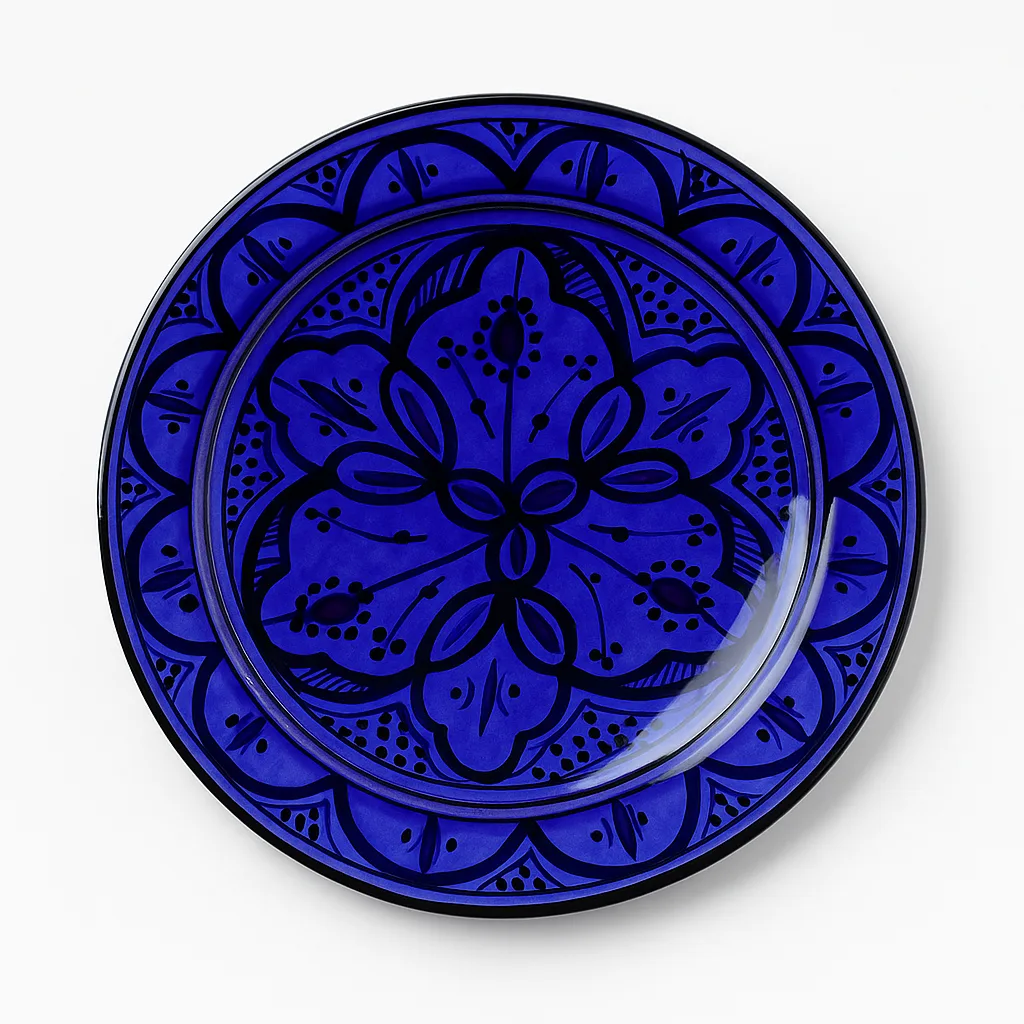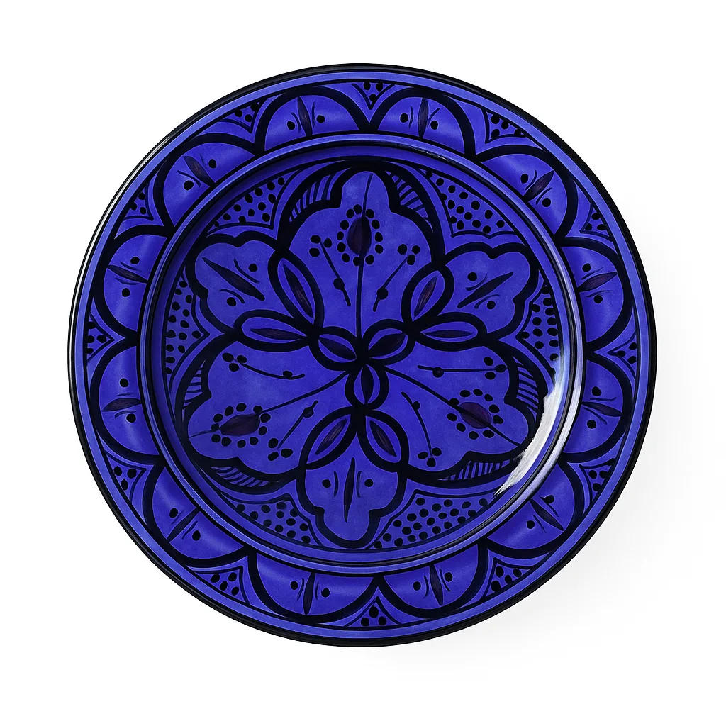 Rich and dramatic, this deep-blue Moroccan plate features bold floral patterns outlined in black. The glossy finish enhances the intensity of the colours, making it a standout décor item or a sophisticated serving plate. A classic example of Fez-style ceramics.