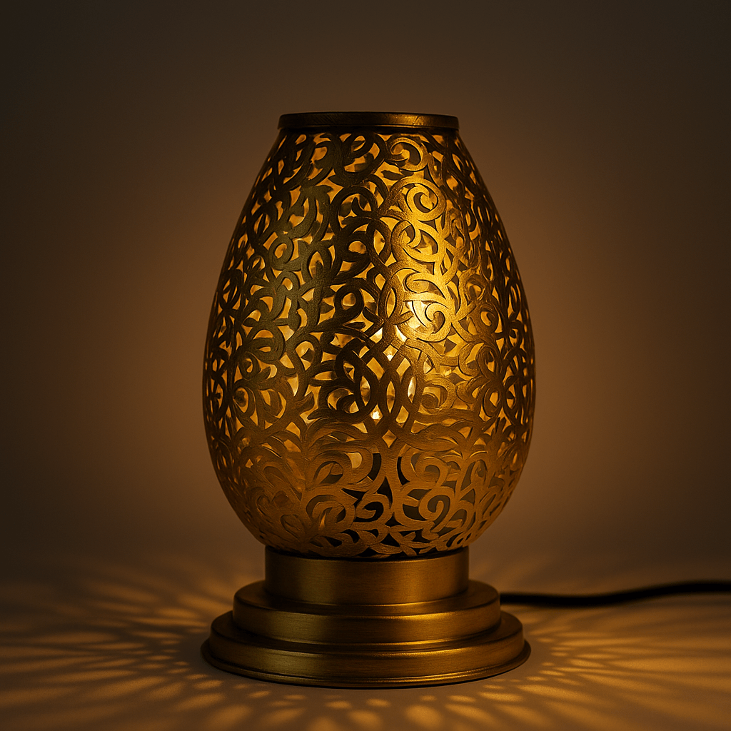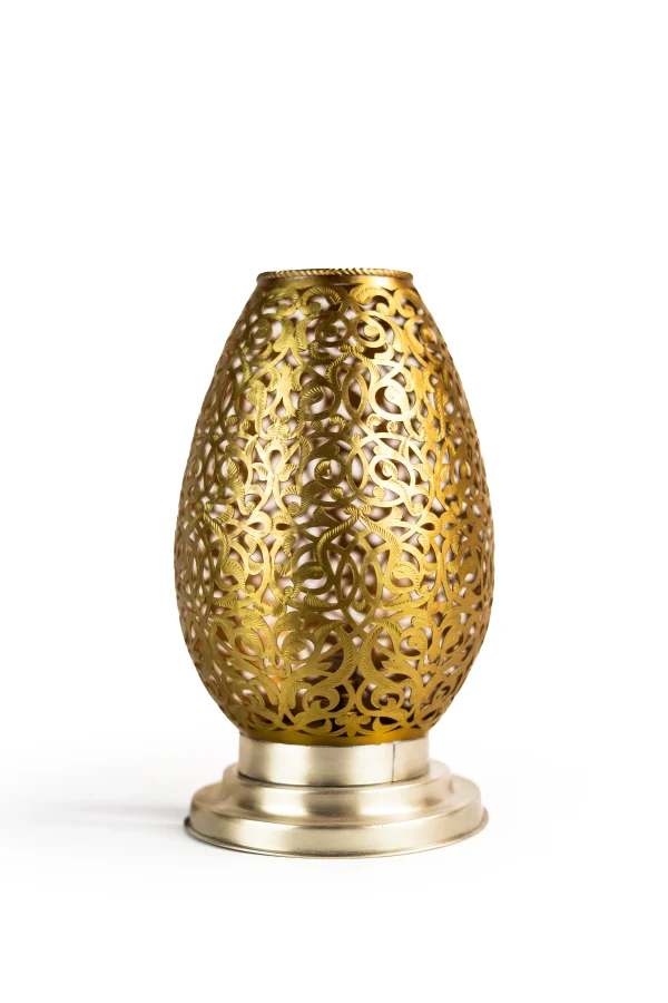 Elevate your home lighting with this exquisite brass table lamp, handcrafted by skilled Moroccan artisans using age-old metalworking techniques. Featuring an egg-shaped silhouette with finely carved floral arabesque patterns, this antique brass table lamp exudes elegance and character. The warm golden brass finish casts a soft, ambient glow through its pierced filigree detailing, creating mesmerizing shadow patterns that bring a sense of charm and serenity to any room.