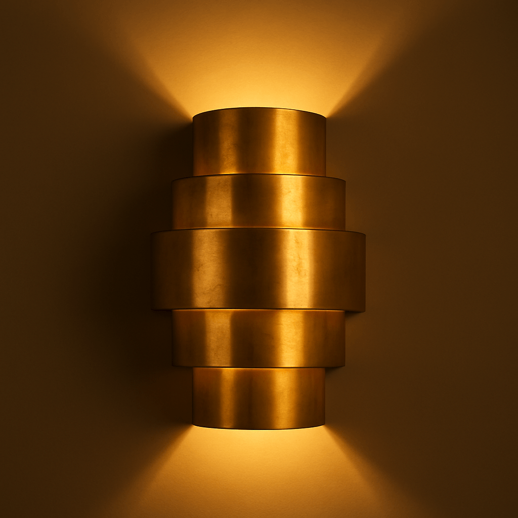 Illuminate your interiors with the timeless allure of this handcrafted Moroccan wall sconce, made from solid brass and shaped into a striking geometric silhouette. Featuring a layered cylindrical design, this piece exudes art deco elegance while capturing the warm glow typical of Moroccan lighting craftsmanship.