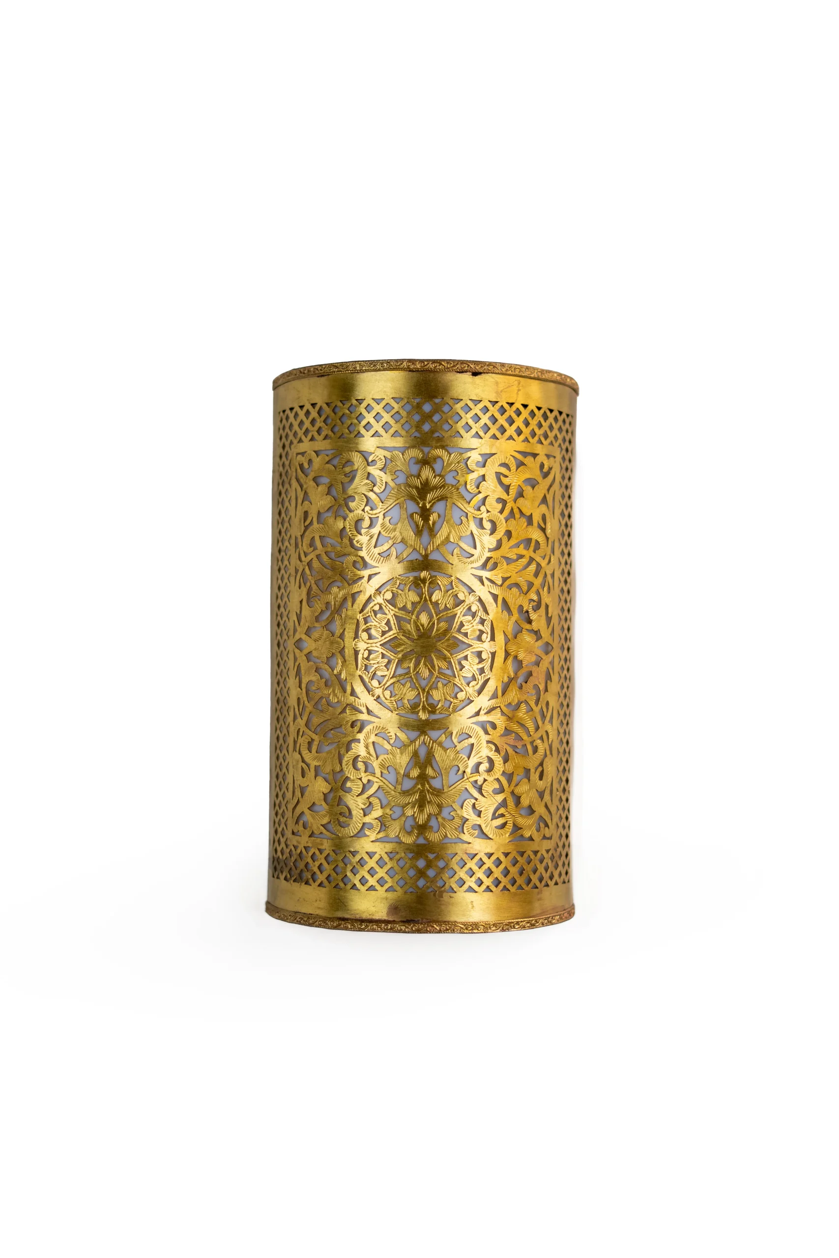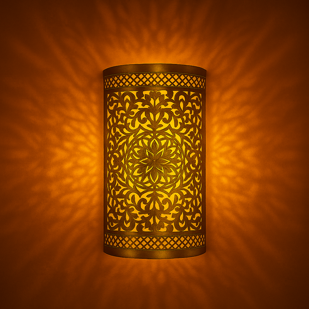 Bring a touch of Moroccan artistry to your interiors with this stunning handcrafted brass wall sconce. Made by skilled Moroccan artisans, this Moroccan wall sconce is shaped in a half-cylinder form and features finely pierced floral and geometric patterns inspired by traditional Maghrebi motifs. The central mandala-like rosette radiates elegance, casting captivating shadows and a warm, ambient glow when lit.