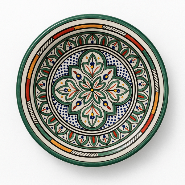 Bring the vibrant spirit of Morocco into your home with the Zellij Gasaa, a traditional ceramic bowl that beautifully showcases the rich heritage of Moroccan craftsmanship. Expertly handcrafted and hand-painted by skilled artisans, this gasaa features classic zellij-inspired motifs—interwoven arches, floral medallions, and geometric borders—arranged in concentric harmony.