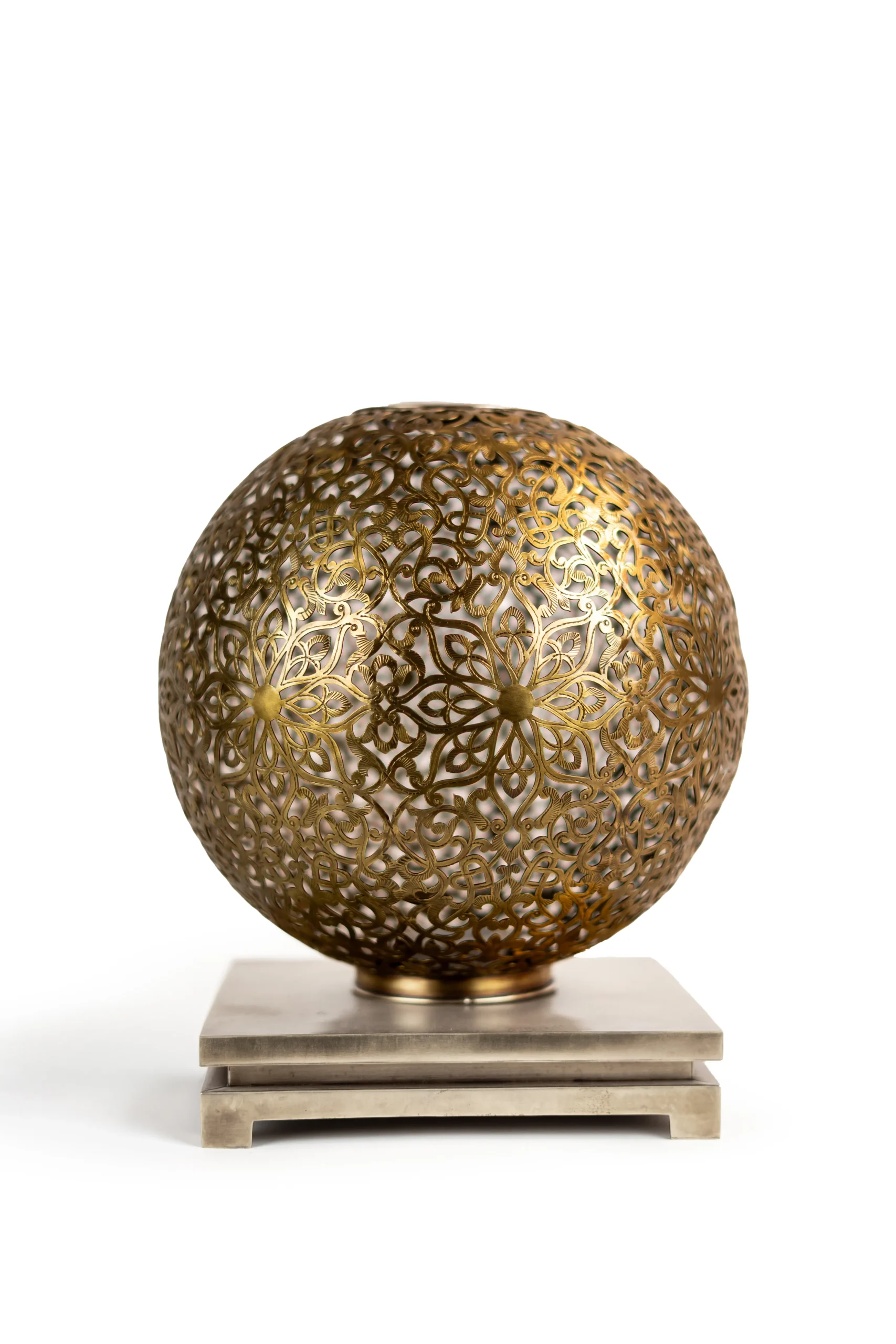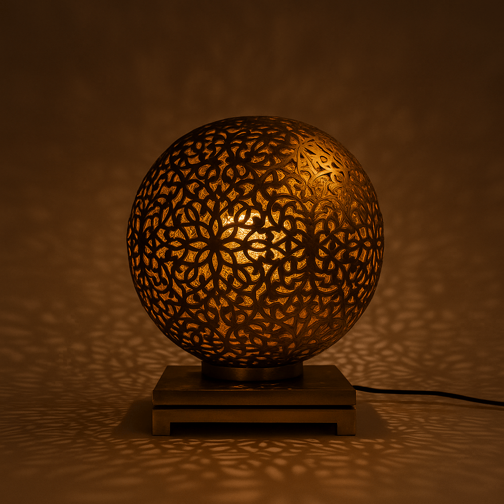 Bring authentic Moroccan charm to your living space with this handcrafted Moroccan table lamp, expertly forged from antique-finished brass. Designed in a spherical globe shape, the lamp features a detailed openwork filigree pattern that projects enchanting shadows across the room when lit — a hallmark of traditional Moroccan craftsmanship.