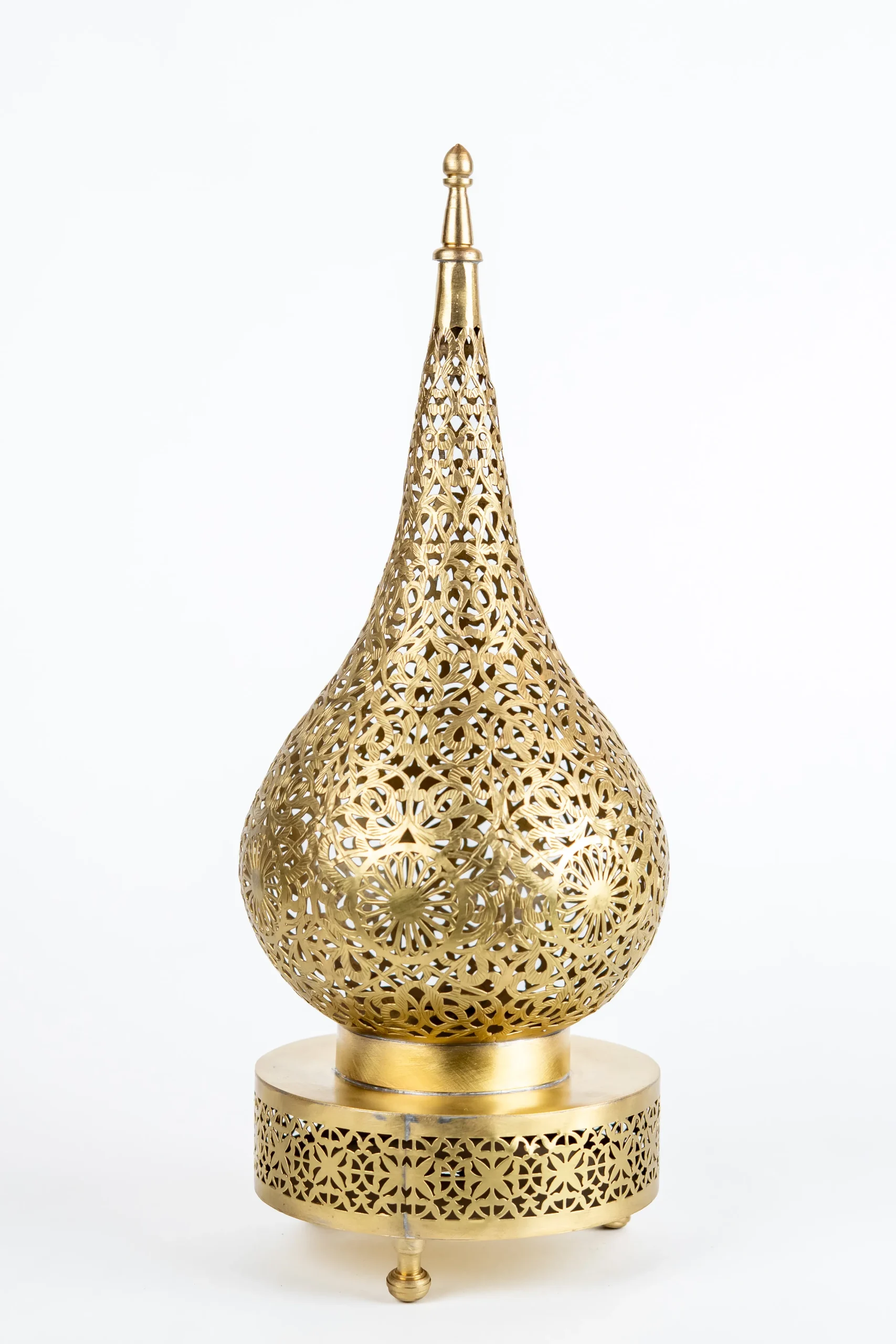 Illuminate your space with this luxurious Moroccan table lamp, handcrafted by skilled artisans in Morocco. Sculpted from solid brass with a rich antique gold finish, its teardrop silhouette draws the eye with graceful curves and a slender pointed crown.
