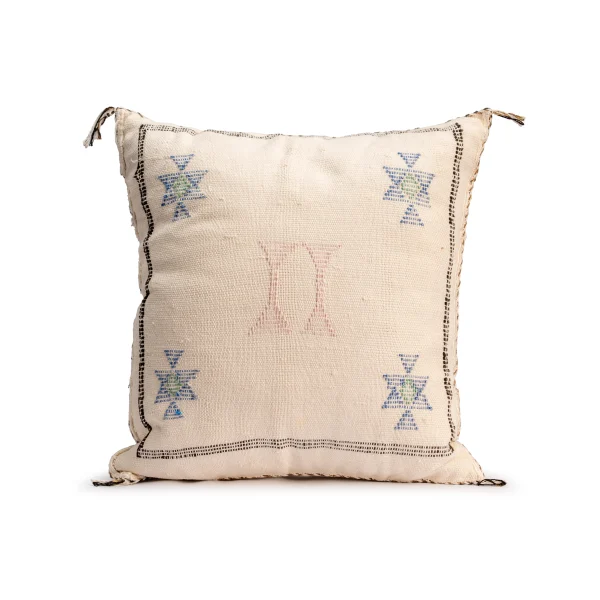 Introduce authentic Berber charm into your interior with this handmade Moroccan Sabra cushion, crafted from durable cactus silk and decorated with symbolic Amazigh motifs. The soft neutral tone is delicately accented by geometric embroidery in pastel shades of blue, pink, and green—offering a tranquil, earthy aesthetic that complements boho, rustic, and minimalist homes alike.