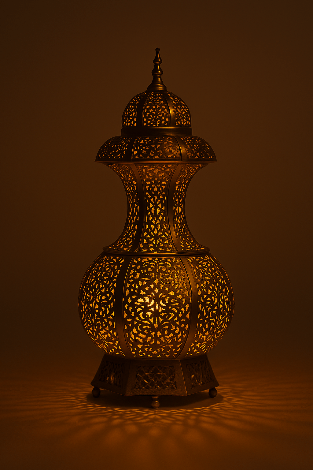 Add timeless character to your interior with this handcrafted brass floor lamp, beautifully shaped in a traditional Moroccan silhouette. This vintage brass floor lamp features a bulbous body with intricate hand-pierced floral and geometric patterns, finished in a rich antique gold tone that softly filters light for a warm, ambient glow. Its dome-shaped crown adds a sculptural, ornamental touch — a true statement piece for living rooms, entryways, or boutique spaces seeking global charm and refined detailing.