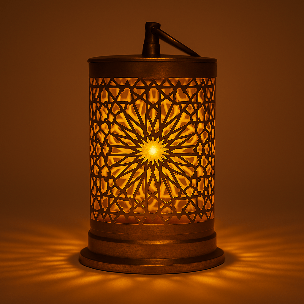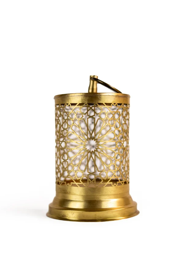Perfect as a small brass table lamp for bedsides, shelves, or decorative corners, this lamp blends cultural artistry with practical beauty. The cylindrical shape and domed base are inspired by traditional Moroccan metalwork, while the pierced geometric pattern allows the light to dance through your room in star-shaped projections.