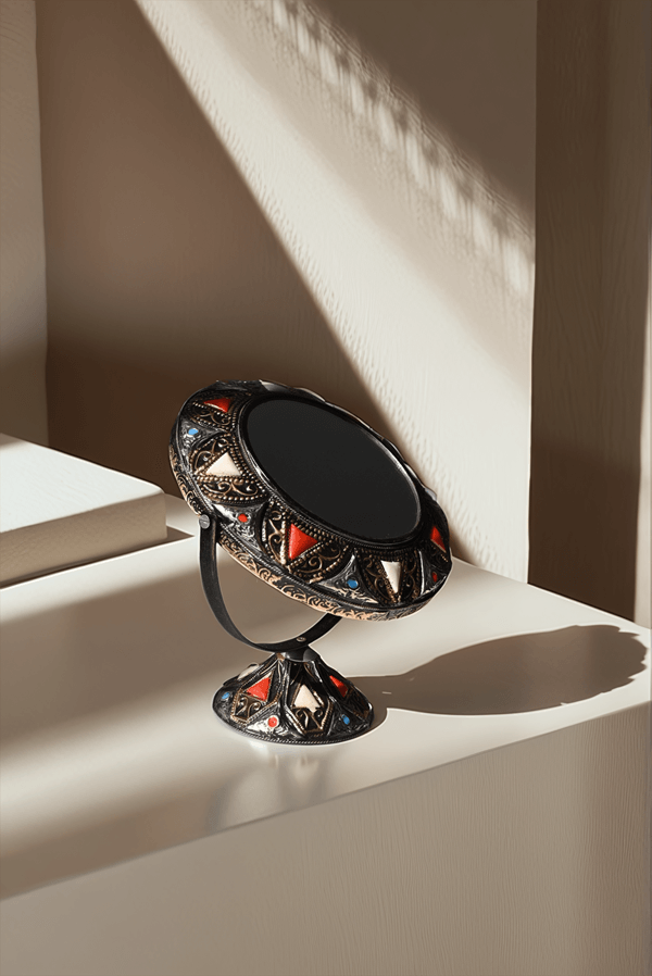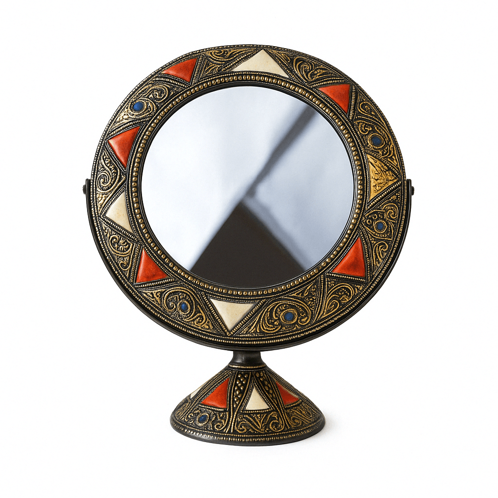 Each detail is carefully crafted using traditional techniques, showcasing a harmonious blend of engraved silver-toned metal, delicate filigree patterns, and colorful resin accents. The base is equally decorated, allowing the mirror to stand gracefully on a vanity, dresser, or any tabletop, making it a functional yet decorative addition to your space.
