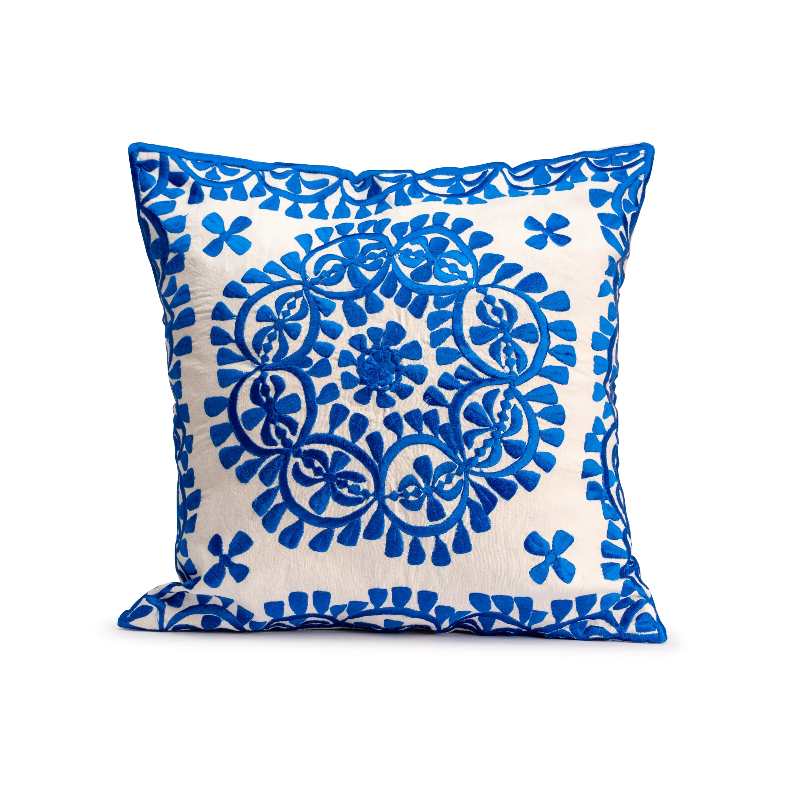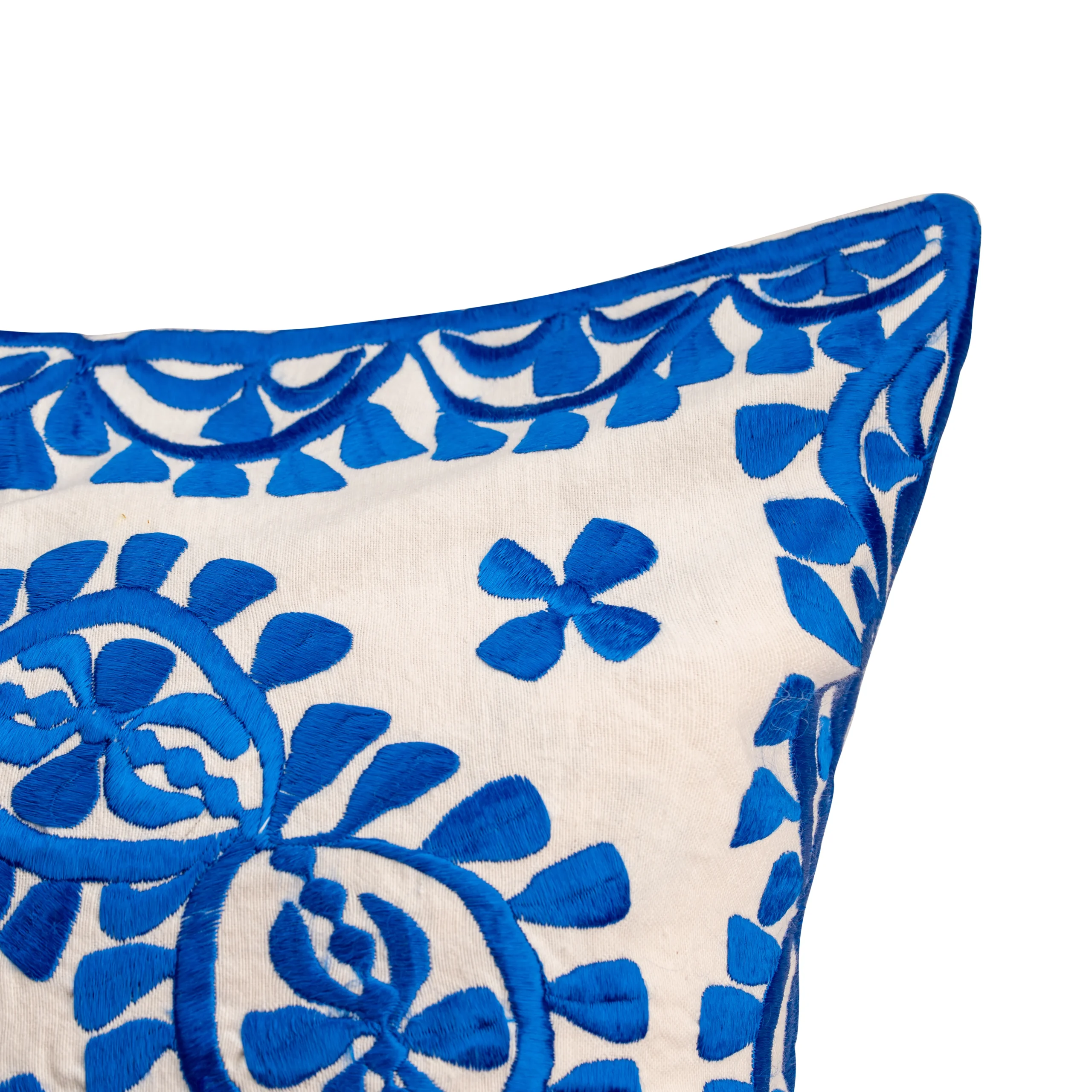 Bring a vibrant Moroccan flair to your living space with this handcrafted embroidered cushion cover in bold cobalt blue. Each pillow is intricately hand-stitched by skilled Moroccan artisans, showcasing a detailed medallion-inspired pattern that adds depth, movement, and a traditional touch to any room. The bright blue embroidery stands out beautifully against the soft cream cotton background, creating a striking yet elegant contrast.