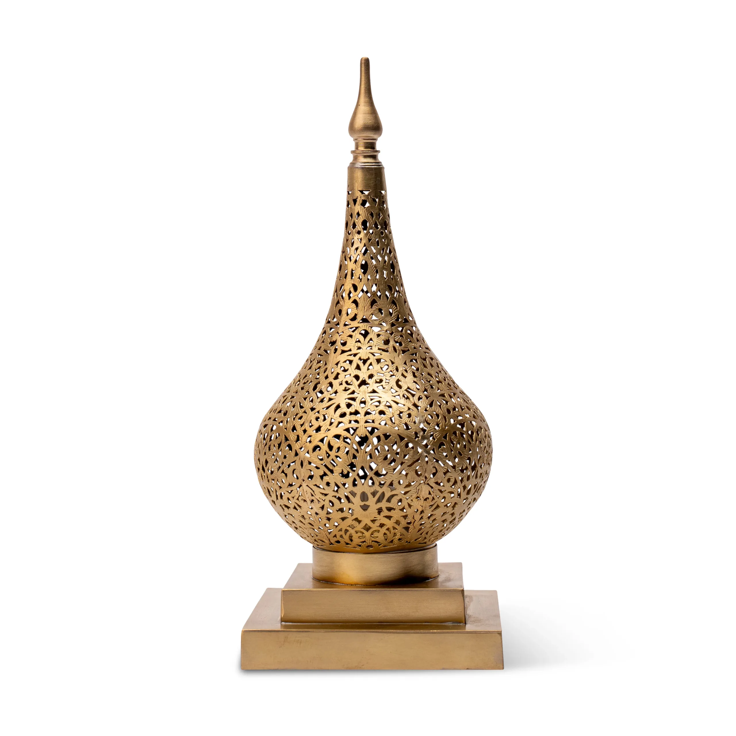 Illuminate your space with the exotic warmth of this handcrafted Moroccan brass floor lamp, designed in a distinctive gourd shape with a tall pointed finial. Every surface is meticulously pierced with intricate arabesque patterns that scatter ambient light across walls and ceilings. Crafted by skilled Moroccan artisans, this piece blends traditional craftsmanship with timeless elegance. Mounted on a solid brass square base, it stands gracefully as a floor accent lamp or a bold tabletop sculpture.