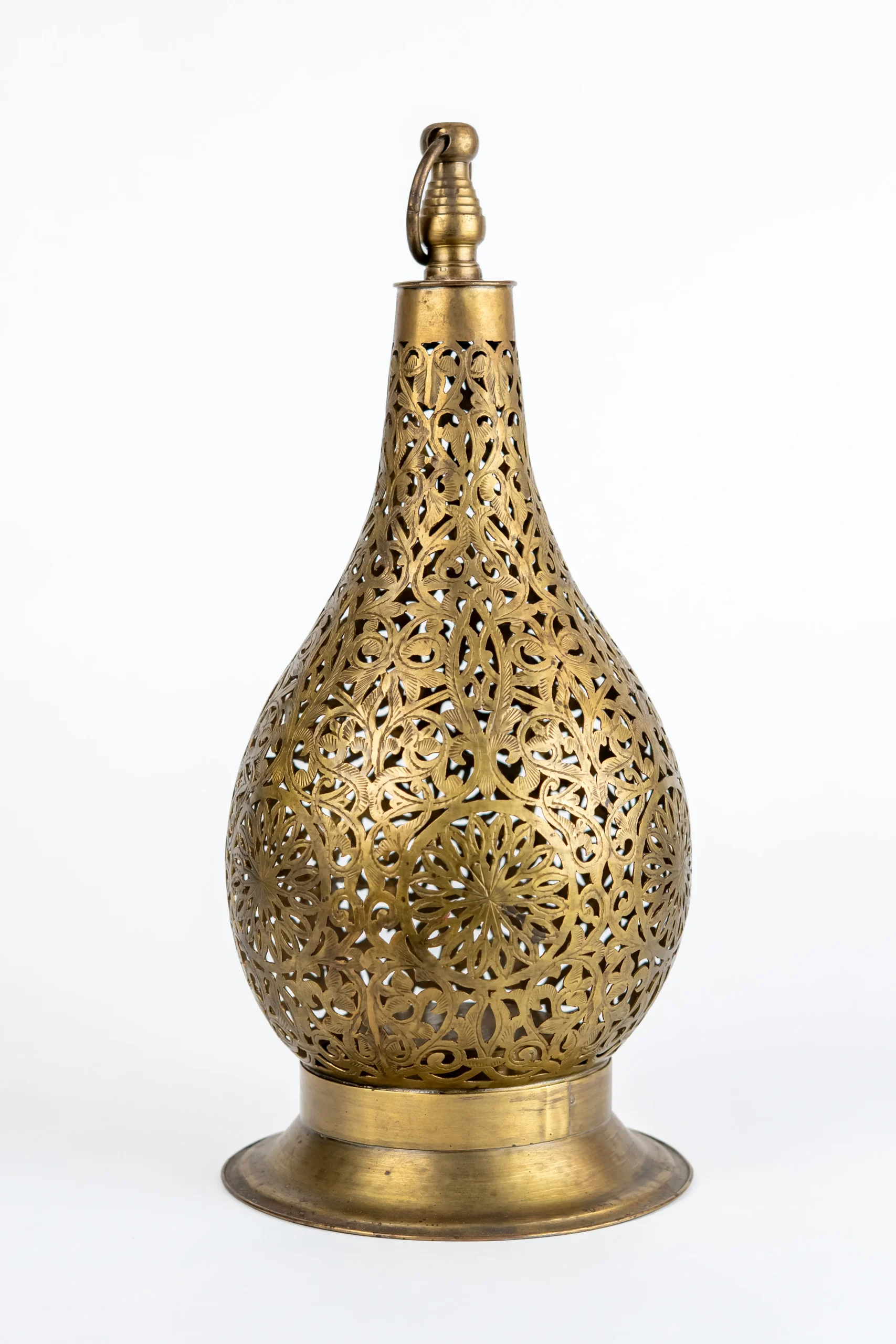 Bring timeless beauty into your home with this handcrafted Moroccan table lamp in antique brass. Designed by skilled Moroccan artisans, the lamp features a teardrop silhouette with exquisitely detailed floral and geometric cut-out patterns that cast stunning shadows when lit.