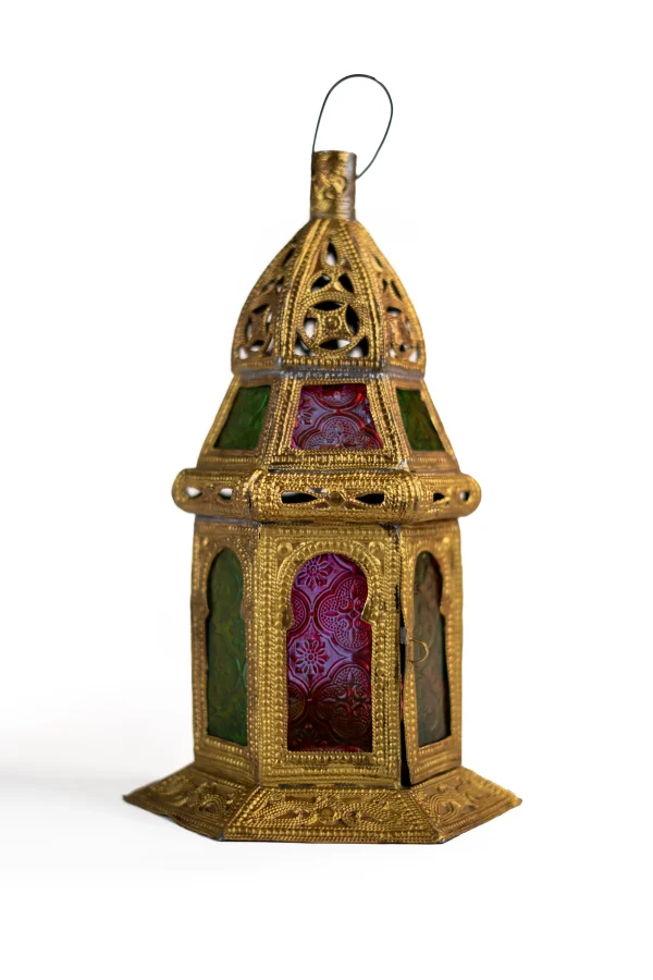 Illuminate your home with authentic elegance using this handcrafted Moroccan table lamp featuring ornate antique brass filigree work and vibrant multicoloured glass panels in red and green hues. This vintage-style piece evokes the timeless charm of Moroccan craftsmanship, blending traditional Islamic arch motifs with a richly embossed pattern on each glass window.