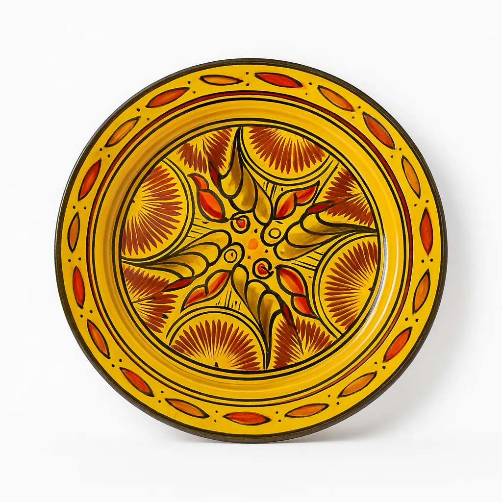 Bright and joyful, this yellow Moroccan plate showcases a blend of sunshine tones and hand-painted motifs in red and black. Ideal for Mediterranean-style dining or wall display, it represents Moroccan artistic heritage. Handmade and glazed, it brings warmth and authenticity to any kitchen.