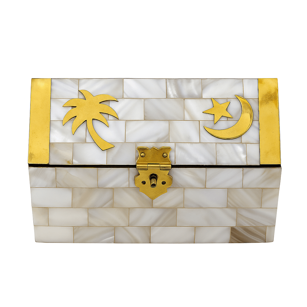 This medium-sized mother pearl jewellery box is a stunning blend of Moroccan artistry and elegance. Handcrafted by skilled artisans, it features beautiful brass inlays of a crescent moon, star, and palm tree, symbolizing timeless charm and tradition. The lustrous mother-of-pearl finish adds a luxurious touch, making it perfect for storing your jewelry, keepsakes, or small valuables. Whether as a thoughtful gift or a stylish décor piece, this box brings a touch of sophistication and craftsmanship to any space.
