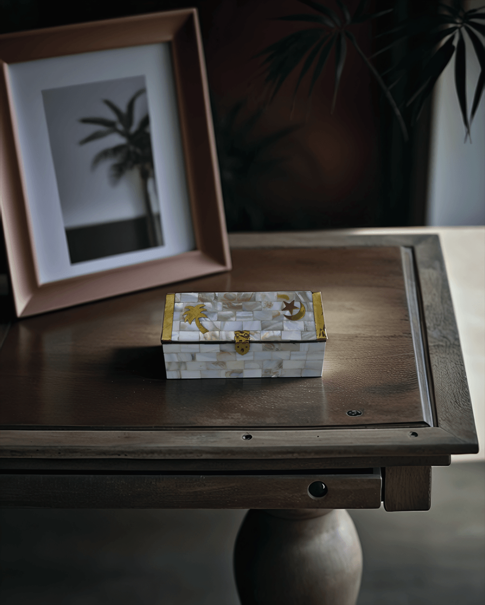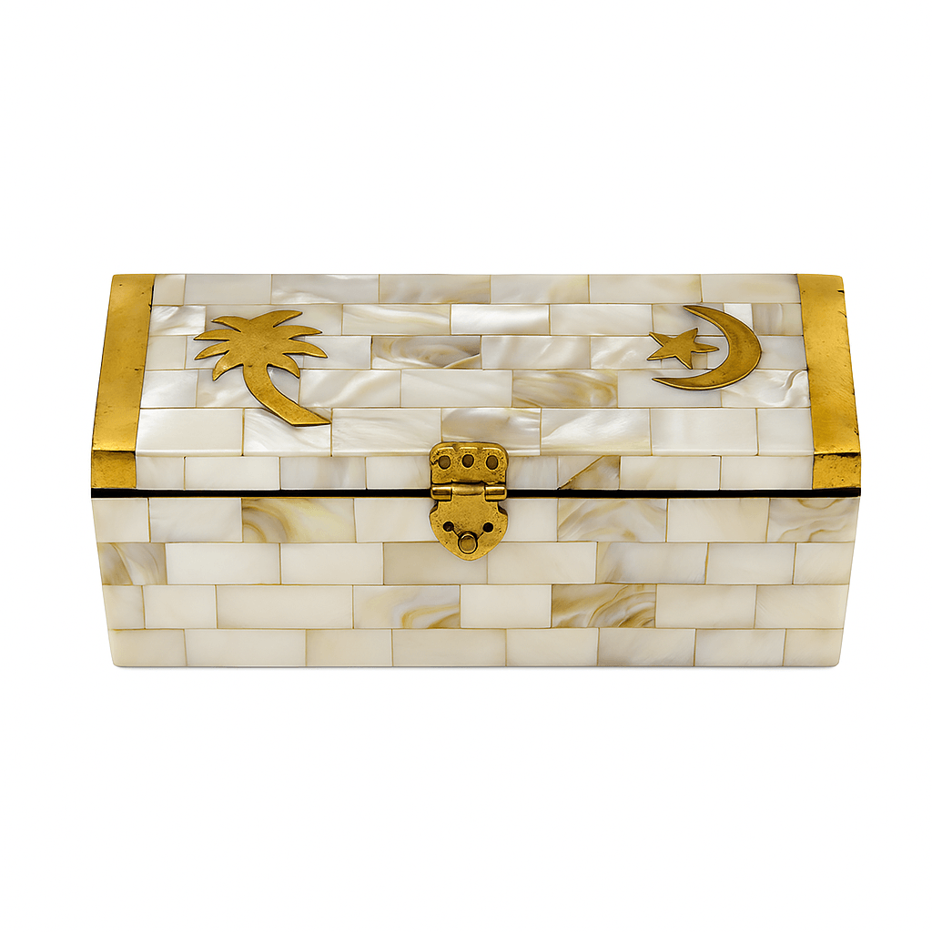 This wide mother pearl jewellery box showcases exquisite Moroccan craftsmanship, blending elegance and tradition. Handcrafted by skilled artisans, it features intricate brass inlays of a crescent moon, star, and palm tree, adding a timeless and refined touch. The shimmering mother-of-pearl finish enhances its luxurious appeal, making it perfect for storing a variety of jewelry, keepsakes, or small valuables. This handcrafted box for jewelry offers both functionality and beauty, serving as a decorative statement piece while keeping your treasures organized. Whether as a gift or an elegant addition to your home, it embodies sophistication and artisanal excellence.