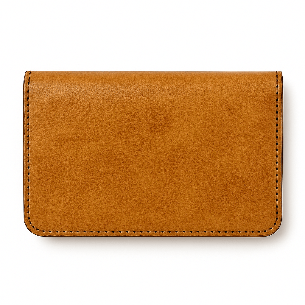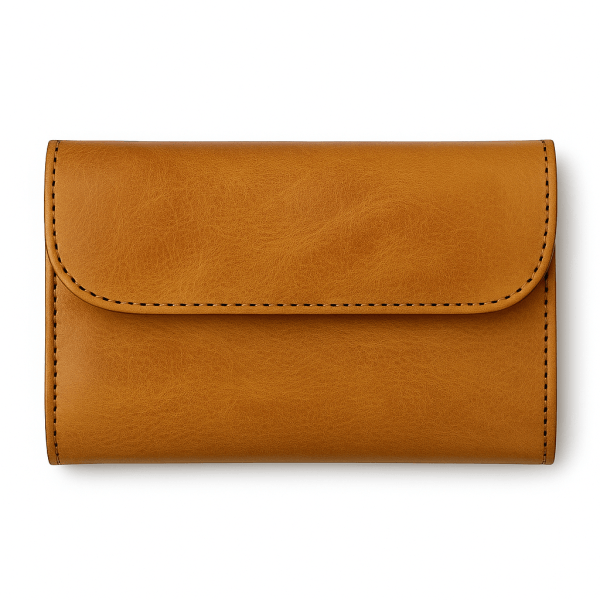 Elegant tan leather coin purse handcrafted in Morocco. Minimalist design with smooth finish, perfect for cards and coins. One-of-a-kind leather wallet, made by artisans using traditional techniques. Approx. 12cm x 8cm.