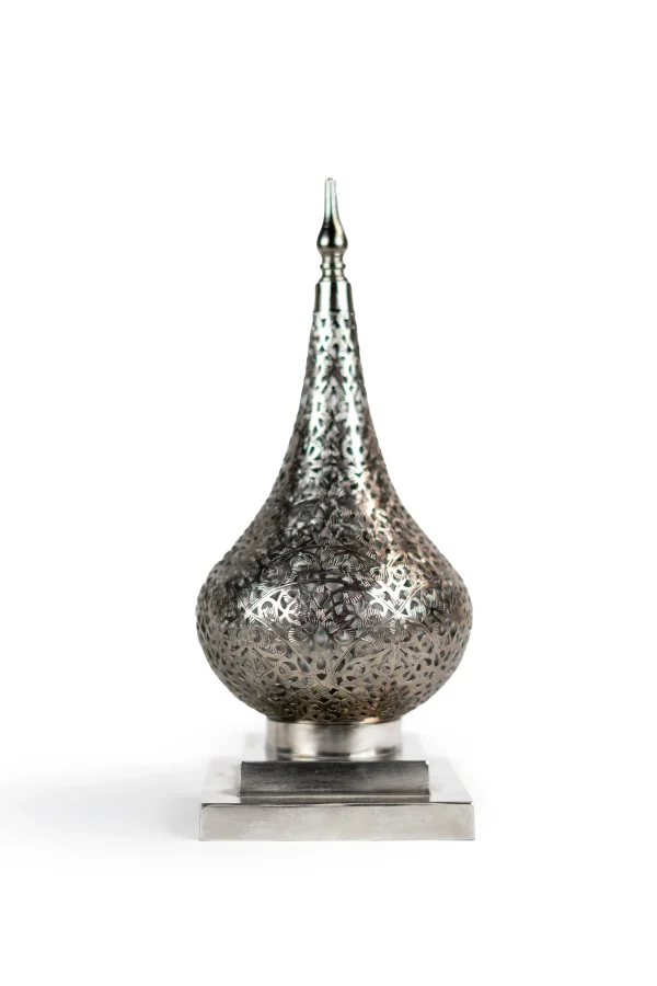Elevate your space with this exquisite Moroccan table lamp, handcrafted from solid brass and finished in an elegant silver tone. Its elongated teardrop silhouette, paired with intricate floral cut-outs, casts enchanting patterns when lit, creating a warm and ambient atmosphere perfect for evenings in the living room or bedroom.