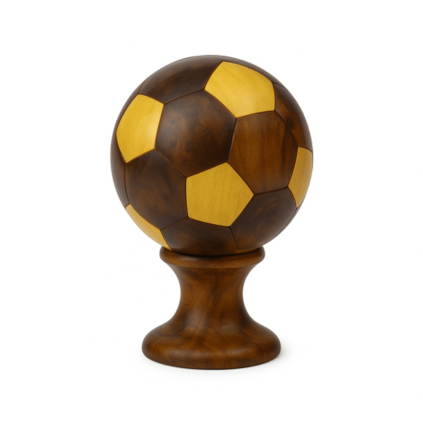 Small Handcrafted Wooden Soccer Ball Display on Elegant StandSmall Handcrafted Wooden Soccer Ball Display on Elegant Stand
