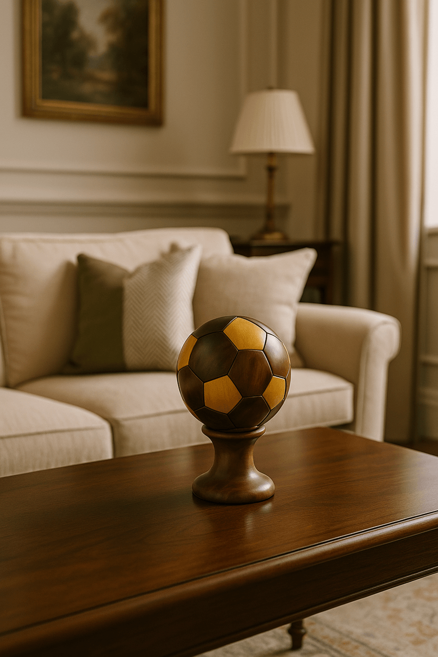 Small Handcrafted Wooden Soccer Ball Display on Elegant Stand