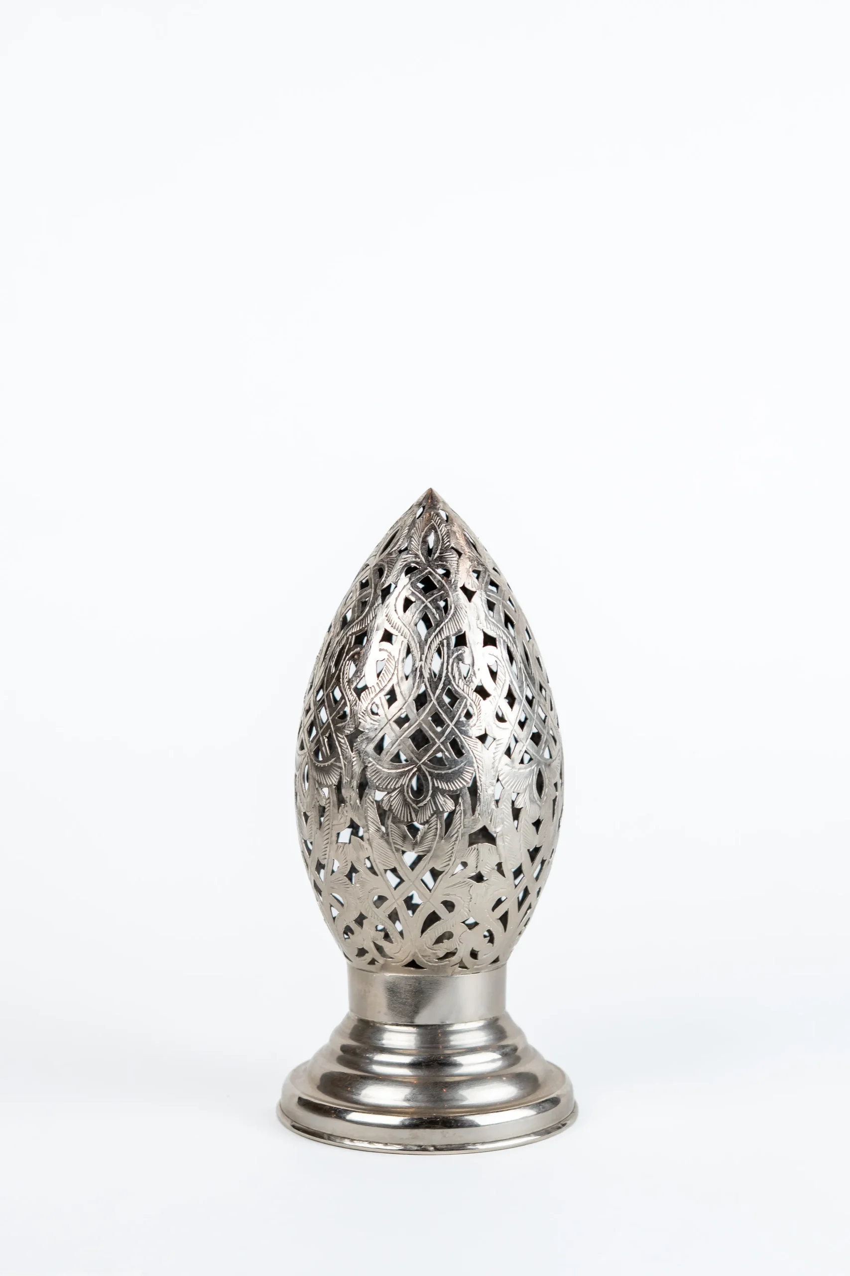 Add a subtle glow and a touch of heritage to your home with this small Moroccan brass table lamp, expertly handcrafted with a timeless pierced floral design. Its compact pinecone-shaped form sits gracefully on a silver-tone stepped base, making it perfect for small spaces like bedside tables, reading corners, or shelves.