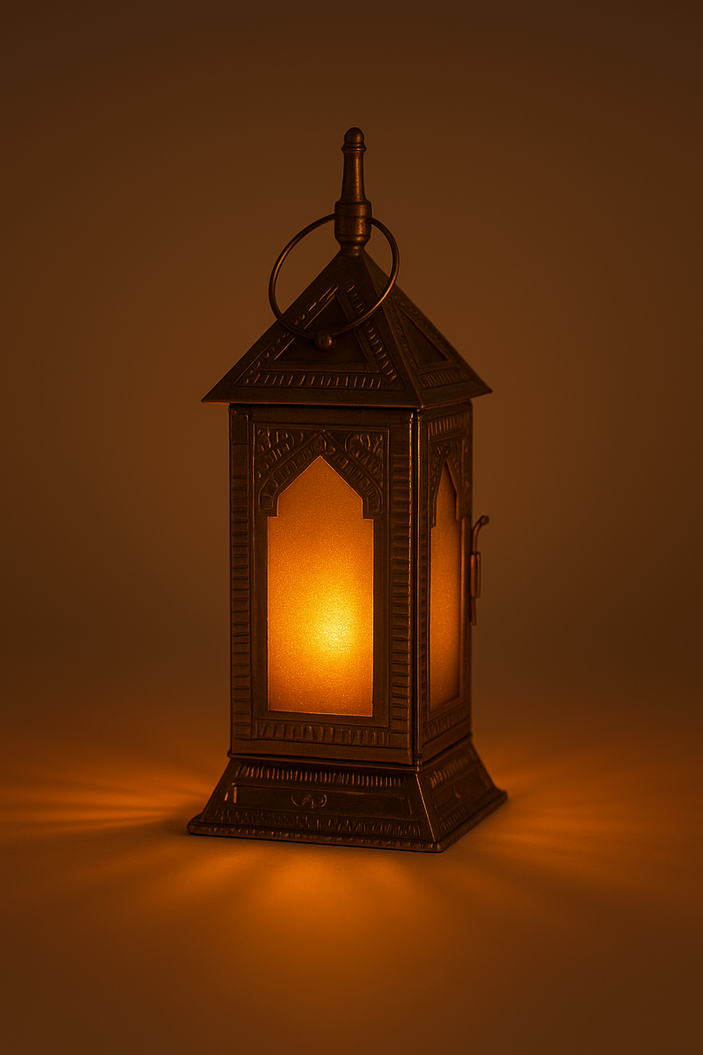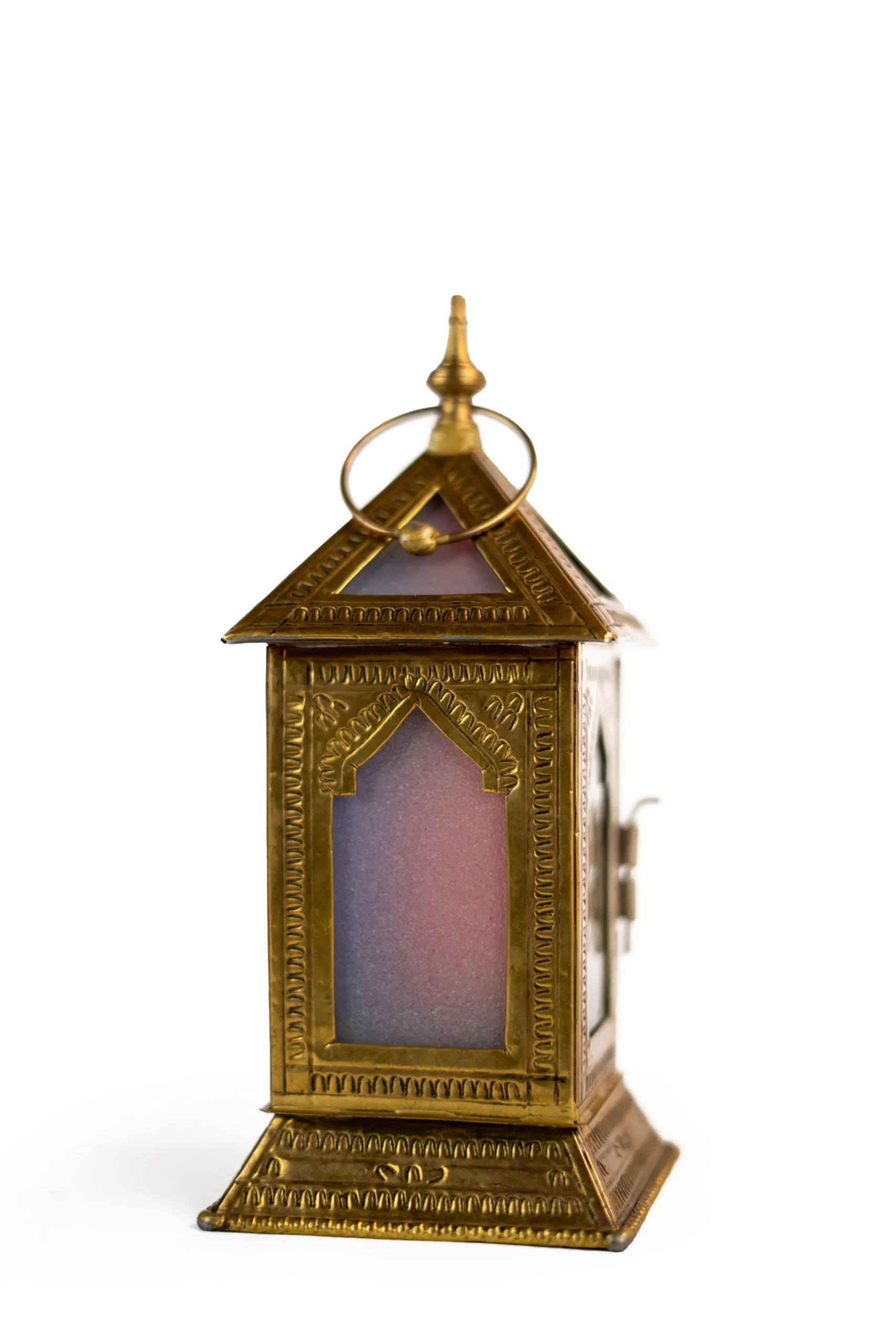 This beautifully detailed lamp combines ornate brass framing with frosted multicoloured glass panels in soft shades of red, violet, and dusky blue, evoking the magical ambiance of North African souks and traditional riads. The top is crowned with a decorative finial and a brass hanging ring, allowing it to double as both a tabletop accent and a hanging lantern.