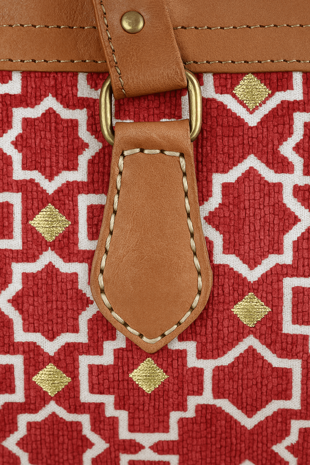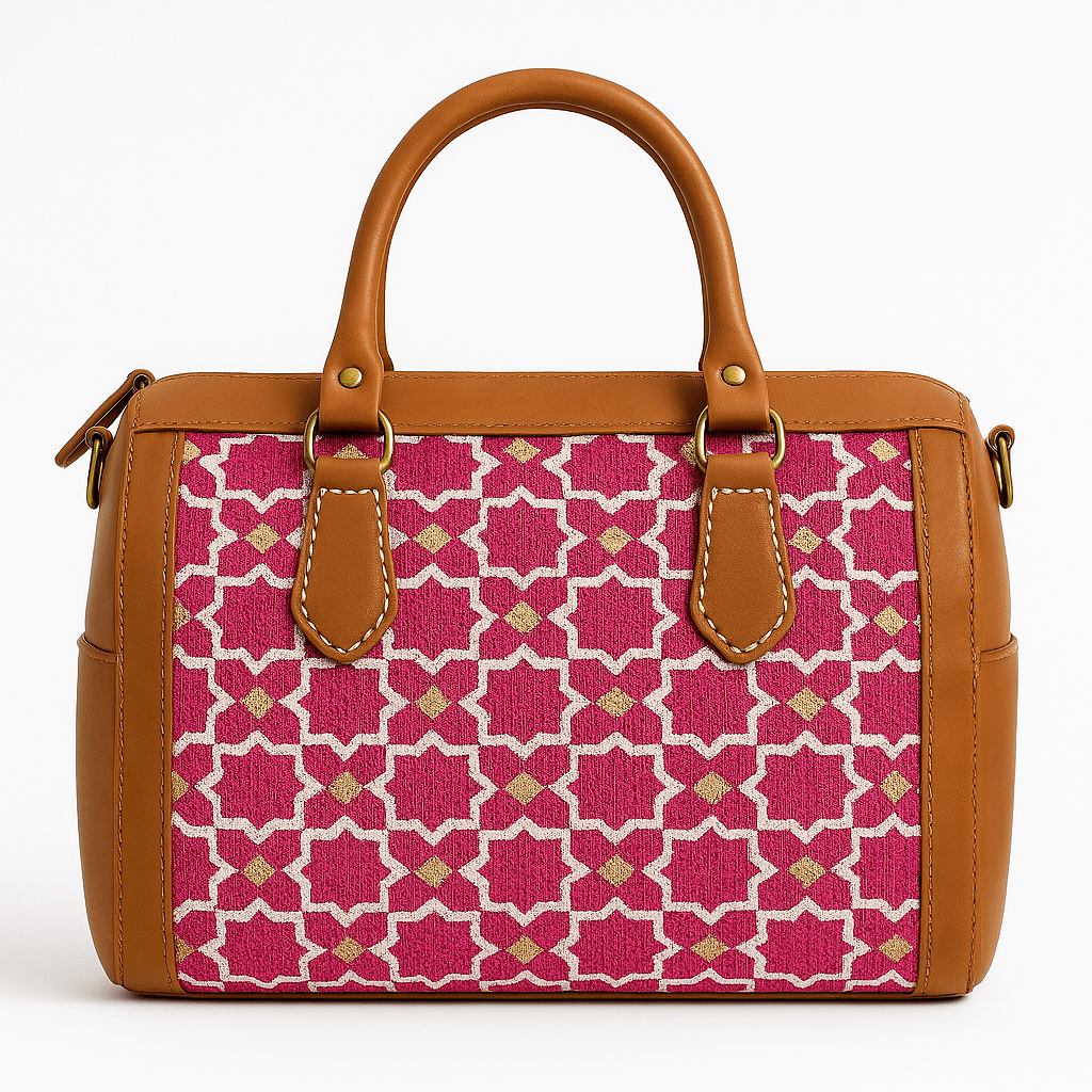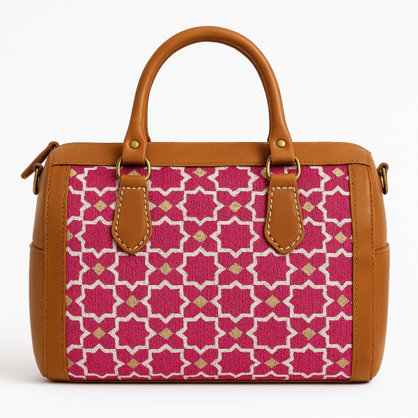 Infuse your style with Moroccan charm and artisanal elegance. This handcrafted tan leather handbag features a vivid pink textile panel adorned with white and golden Moroccan star motifs — a classic pattern reimagined in fresh, modern hues. The structured silhouette is balanced by soft curves and finished with brass-toned hardware and stitched leather handles.