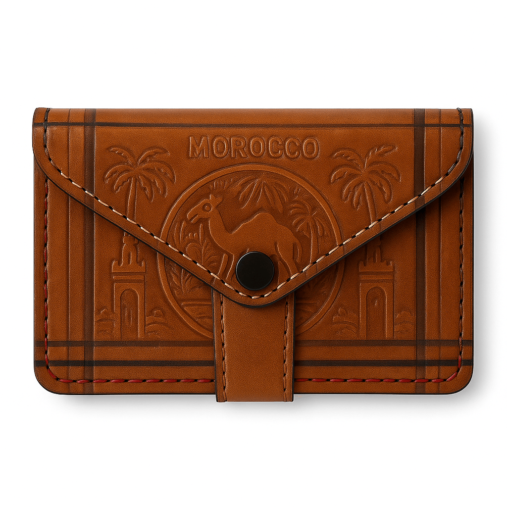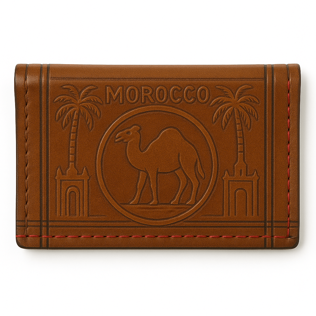 Handcrafted tan leather card holder embossed with “Morocco,” featuring a camel, palms, and iconic Moroccan arches. Ideal for coins, folded notes, or essential cards. Made from real Moroccan leather. One unique piece only. Approx. 12cm x 8cm.