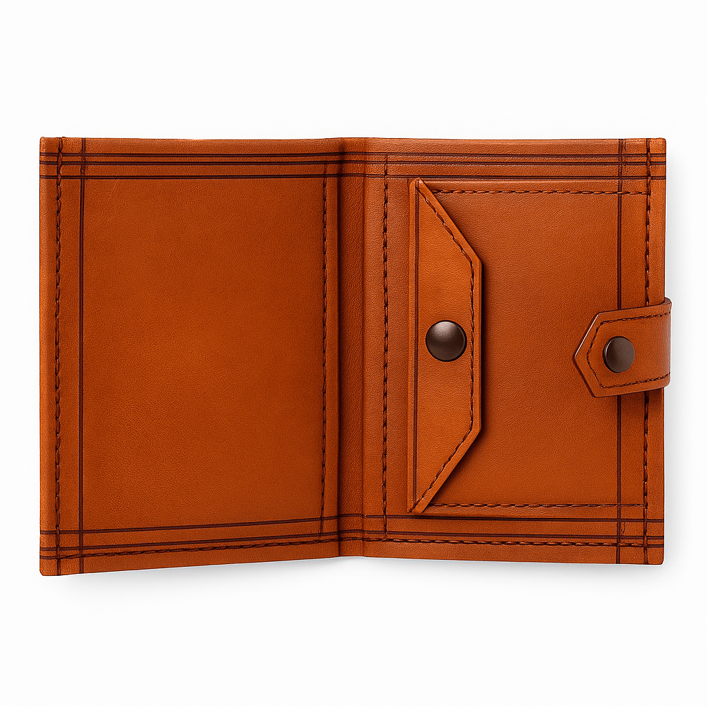 Upgrade your everyday essentials with this handcrafted tan leather wallet, made from 100% genuine Moroccan leather by skilled artisans in Marrakech. Designed for both function and refined taste, this wallet features a classic bifold design and a secure snap-button coin pocket for added practicality.