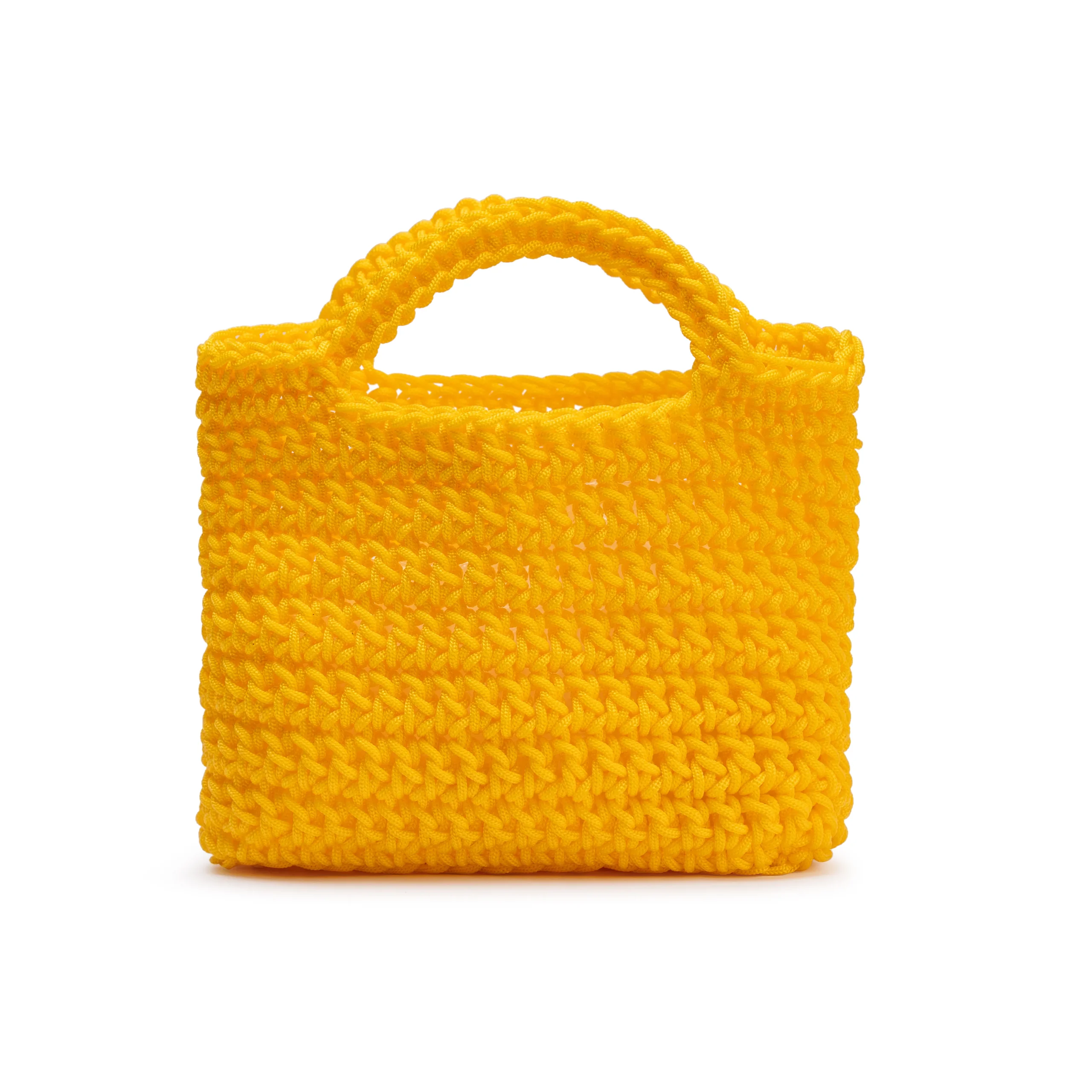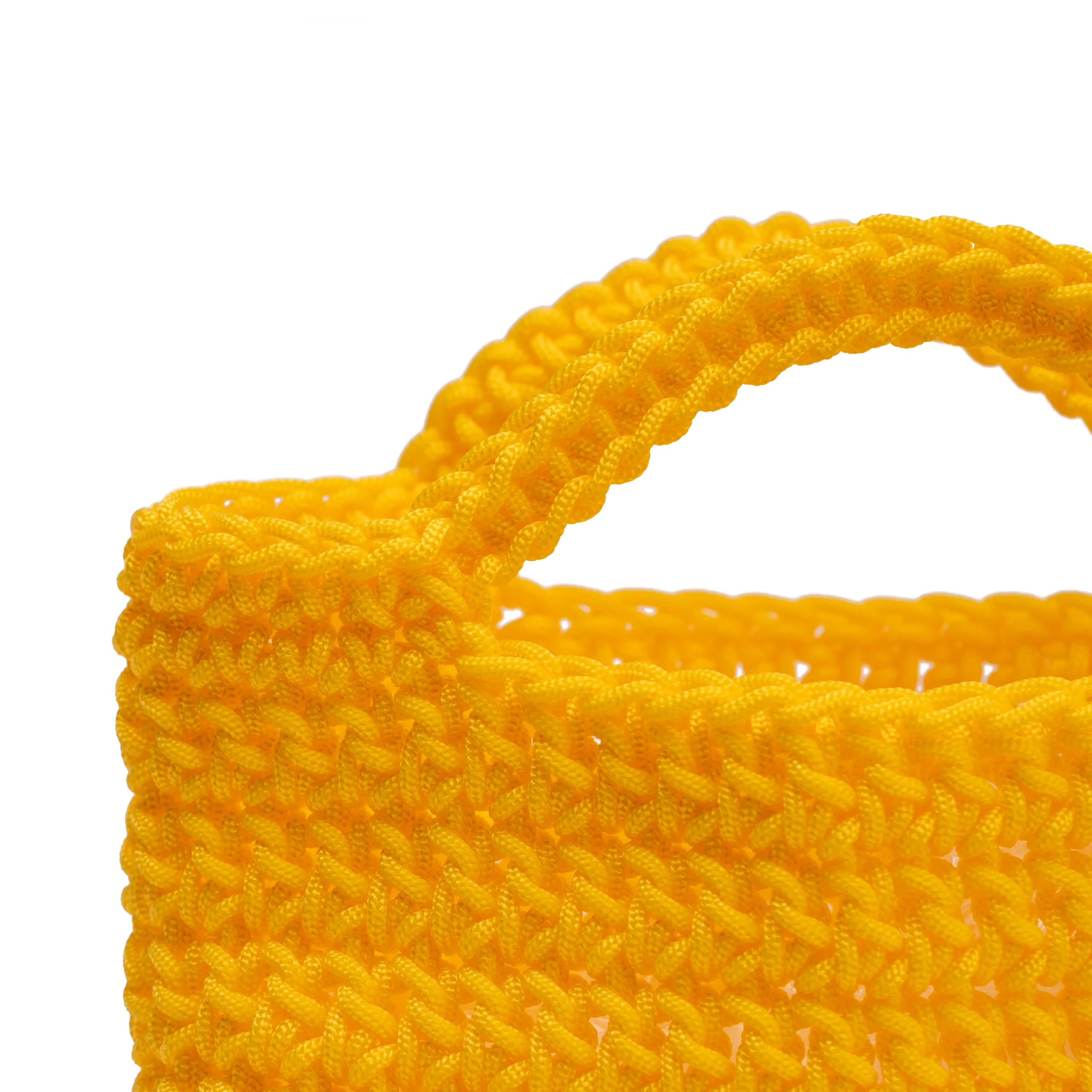 Add a burst of colour to your look with this yellow crochet clutch purse, a radiant piece that fuses bold style with artisan craftsmanship. Handwoven in a structured stitch, it features a firm box shape and short carry handles – offering the charm of a mini tote bag with the clean look of a clutch.