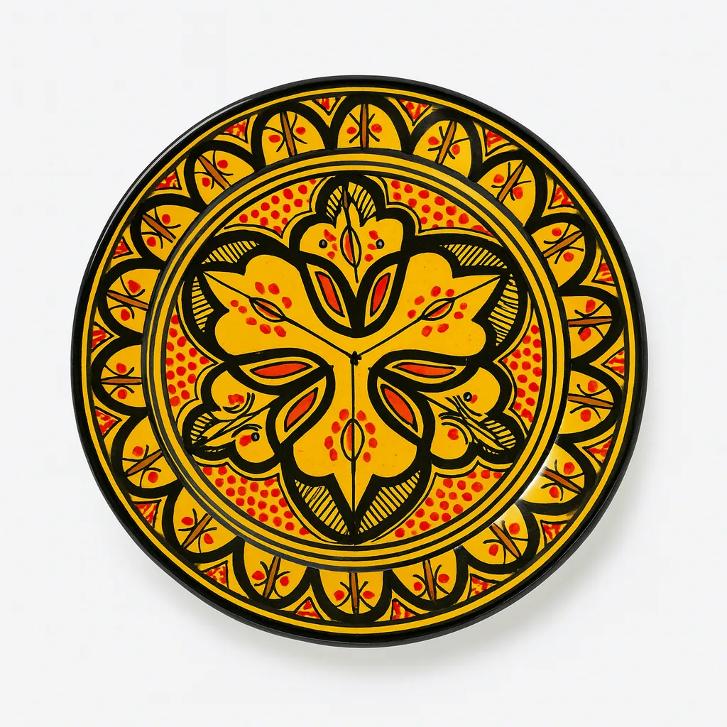 This vibrant yellow Moroccan plate brings energy and tradition to your kitchen. Painted by local artisans using bold Amazigh motifs, it’s a standout addition to Moroccan kitchenware or wall décor.